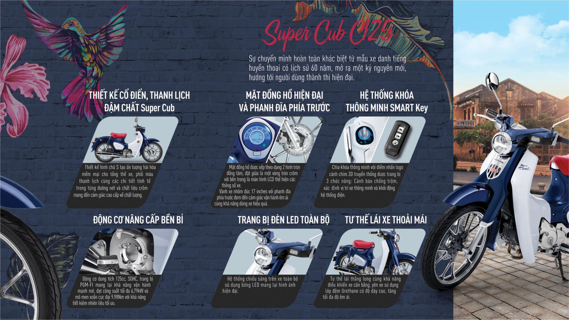Khối lượng bản thân 108kg Dài x Rộng x Cao 1.910 x 718 x 1.002mm Khoảng cách trục bánh xe 1.243mm Độ cao yên 780mm Khoảng sáng gầm xe 136mm Dung tích bình xăng 3,7 lít Kích cỡ lốp trước/ sau Lốp trước: 70/90-17M/C 38P Lốp sau: 80/90-17M/C 50P Loại động cơ PGM-FI, SOHC 4 kỳ, 1 xi lanh, làm mát bằng không khí Đường kính x hành trình pít-tông 52,4 x 57,9mm Tỉ số nén 9,3:1 Công suất tối đa 6,79kW tại 7.500 vòng/phút Mô-men cực đại 9,98Nm tại 5.000 vòng/phút Dung tích nhớt máy Sau khi rã máy: 1,0 lít Sau khi xả: 0,8 lít Loại truyền động 4 sốThiết kế Super Cub 125